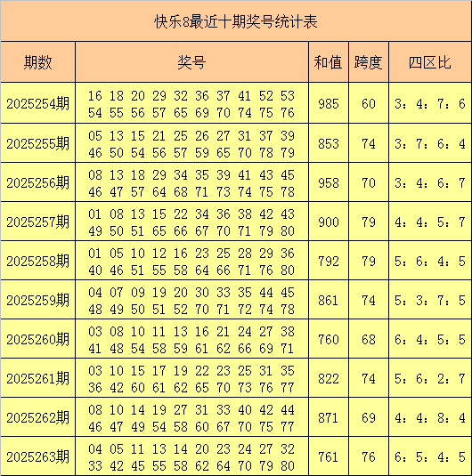 温顺8第2025263期奖号开出:04 05 11 13 14 20 23 24 27 32 33 42 45 55 58 62 64 70 79 80,其中奖号和值为761,跨度为76,四区比为6:5:4:5。